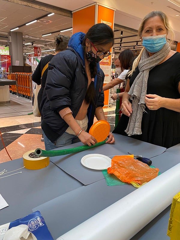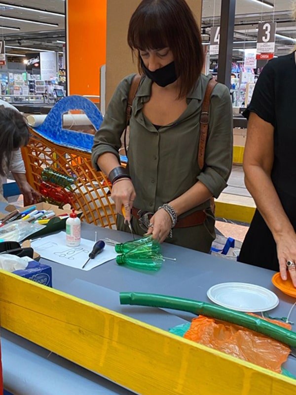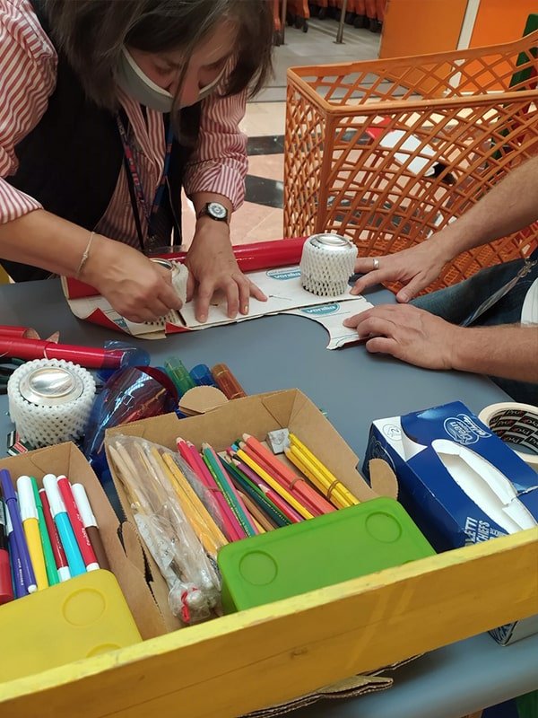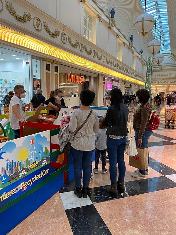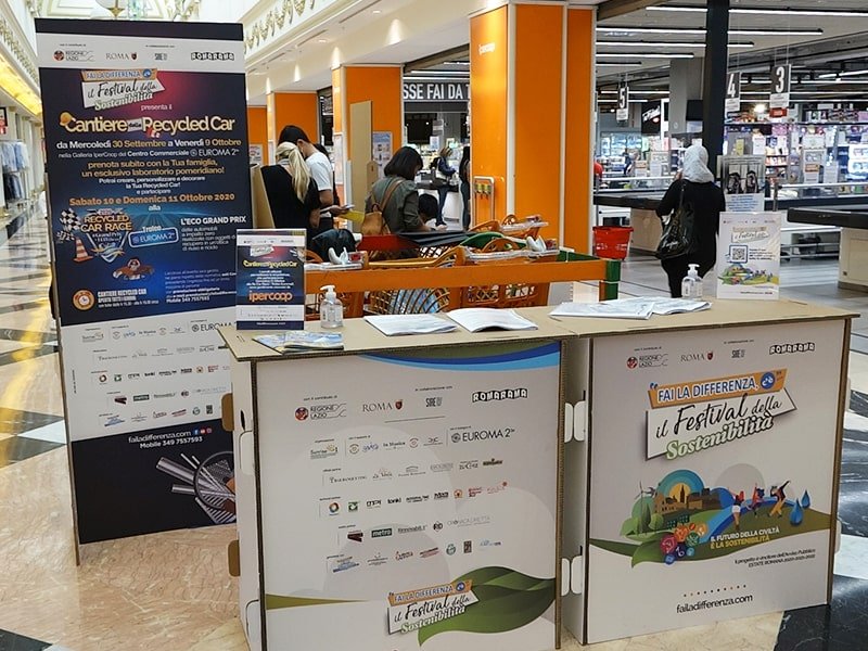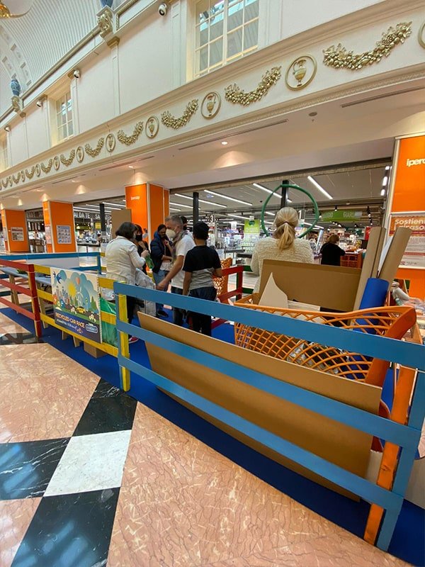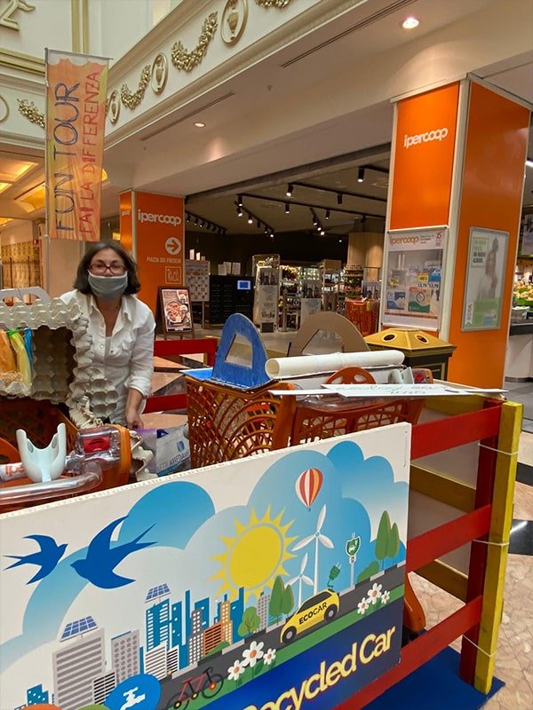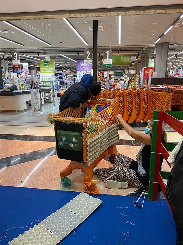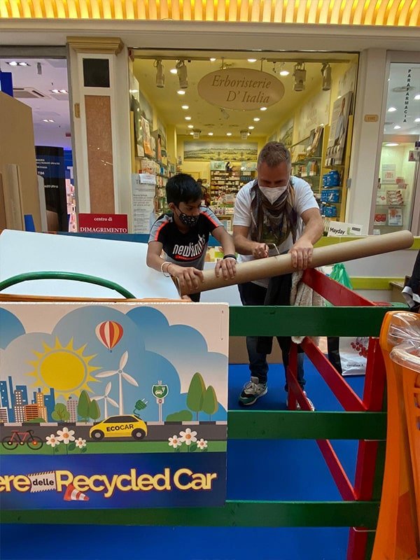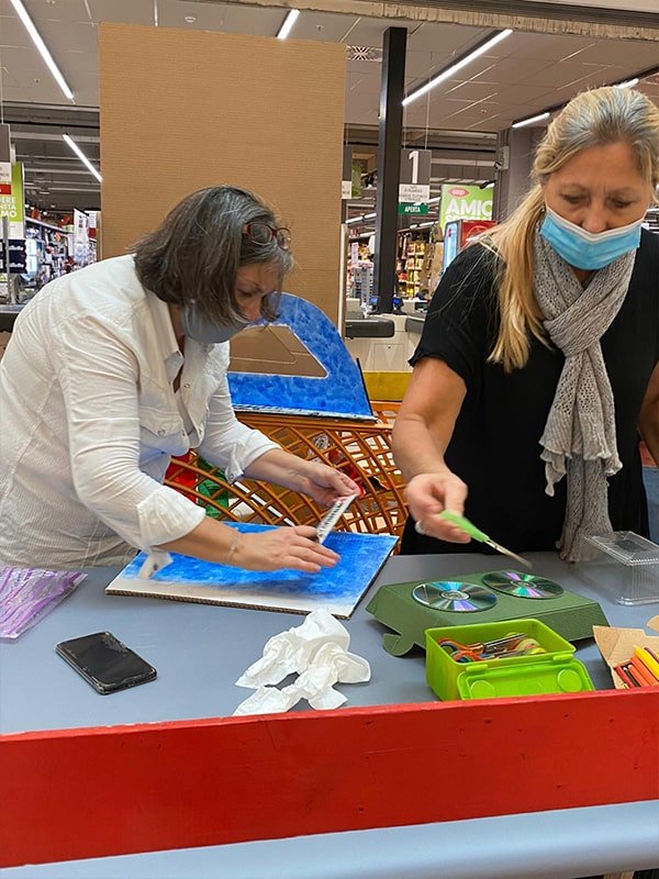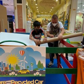 Foto che raccontano il Cantiere delle Recycled Car, il laboratorio dove i Green Team hanno personalizzato e decorato la scocca dei carrelli della spesa realizzati in plastica riciclata della IperCoop di Euroma2 e che hanno poi partecipato alla Recycled Car Race - il Grand Prix delle auto riciclate con trazione ad impatto zero.